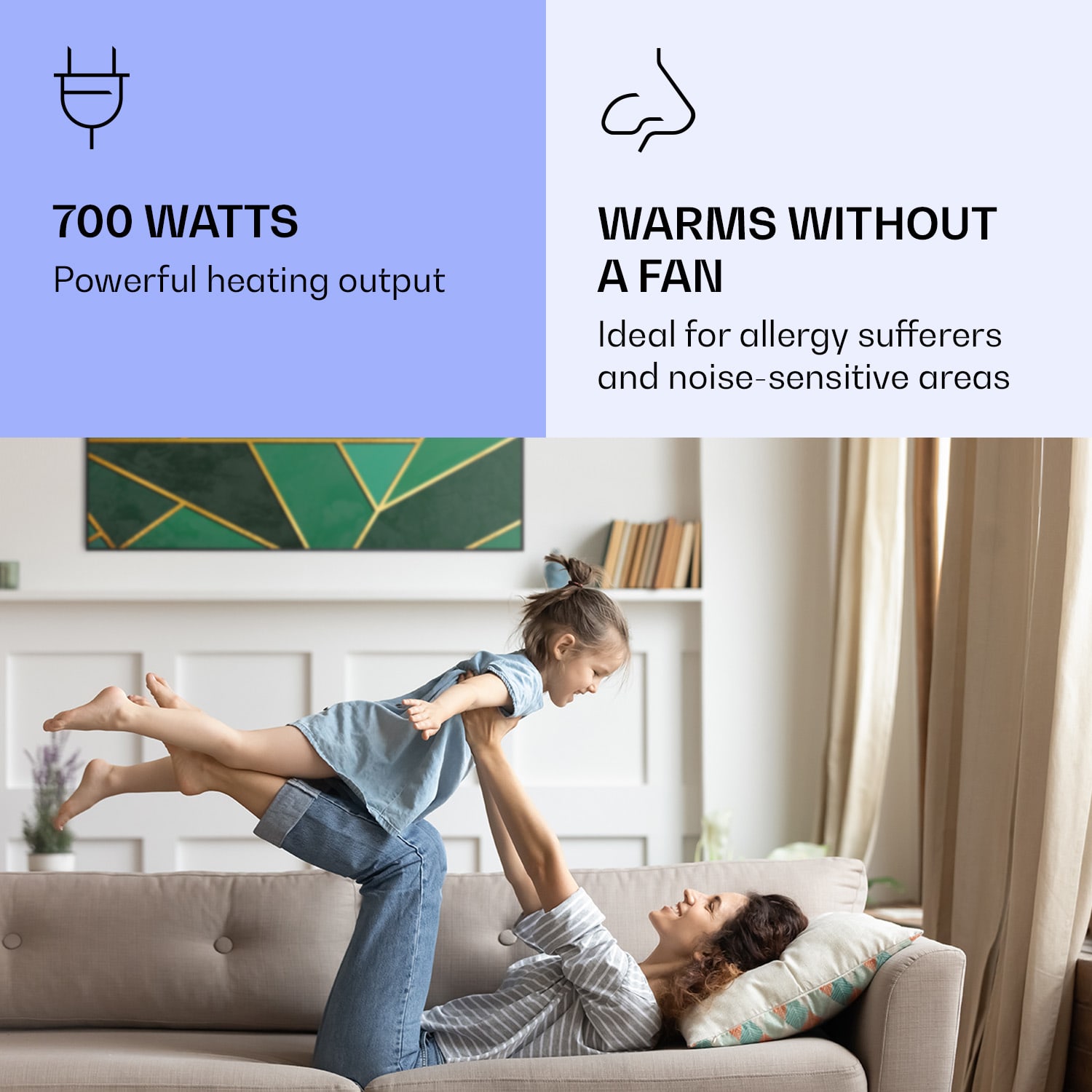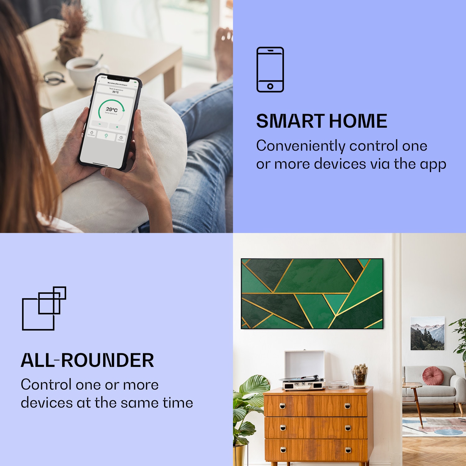 Infračervený ohrievačKlarstein Air Art Smart kombinuje vysoko efektívny vykurovací výkon s pôsobivým dizajnom a najnovšou technológiou. Prináša príjemné teplo a tiež nový lesk a farbu do každej miestnosti a pritom je energeticky veľmi efektívny a ekologický vďaka svojej infračervenej technológii. So svojím silným výkonom 700 W a vďaka technológii IR ComfortHeat šíri k ľudskej pokožke veľmi príjemné teplo, ktoré je vyžarované cielene na osoby v blízkosti ohrievača. Ovládaj veľmi jednoducho pomocou smartfónu, diaľkového ovládača alebo ovládacieho panela jeden ohrievač alebo viacero ohrievacích zariadení. Tento Infrapanel obraz sa dokonale hodí do každého interiéru. Vitaj v budúcnosti vykurovacej techniky: infračervený ohrievačKlarstein Air Art Smart.