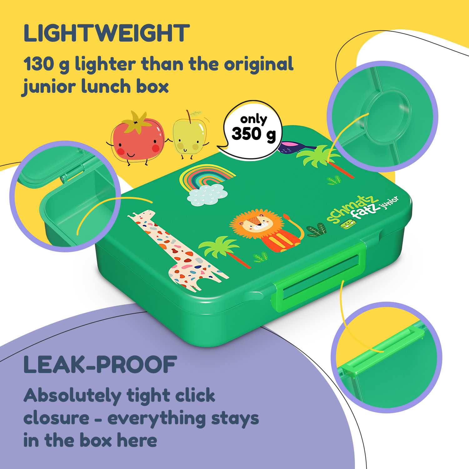 Či už vaše dieťa vyráža do škôlky, školy alebo na výlet, desiatový box Schmatzfatz Lite sa postará o to, aby každé občerstvenie zostalo čerstvé, chutné a prehľadne usporiadané počas celého dňa.Vďaka viacerým oddeleným priehradkám môžete jedlo jednoducho roztriediť – ovocie zostane svieže, syr si zachová svoju chuť a pečivo sa nepremočí. Vnútorný uzáver a vzduchotesné tesnenie zabezpečia, že ani hustejšie potraviny ako jogurt či jablkové pyré sa nevylejú. Box je vyrobený z ľahkého a odolného Tritanu bez BPA, čo zaručuje bezpečné a zdravotne nezávadné používanie. V porovnaní s bežnými desiatovými boxmi váži o tretinu menej, takže nezaťaží školský batoh ani tých najmenších.Údržba je rýchla a jednoduchá – vnútro boxu môžete vyčistiť ručne, vonkajší obal stačí utrieť vlhkou handričkou. Vďaka kvalitnému spracovaniu box vydrží aj pri každodennom používaní.