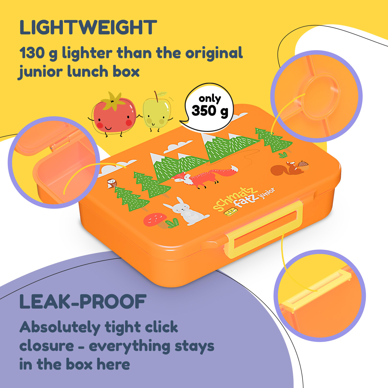 Či už vaše dieťa vyráža do škôlky, školy alebo na výlet, desiatový box Schmatzfatz Lite sa postará o to, aby každé občerstvenie zostalo čerstvé, chutné a prehľadne usporiadané počas celého dňa.Vďaka viacerým oddeleným priehradkám môžete jedlo jednoducho roztriediť – ovocie zostane svieže, syr si zachová svoju chuť a pečivo sa nepremočí. Vnútorný uzáver a vzduchotesné tesnenie zabezpečia, že ani hustejšie potraviny ako jogurt či jablkové pyré sa nevylejú. Box je vyrobený z ľahkého a odolného Tritanu bez BPA, čo zaručuje bezpečné a zdravotne nezávadné používanie. V porovnaní s bežnými desiatovými boxmi váži o tretinu menej, takže nezaťaží školský batoh ani tých najmenších.Údržba je rýchla a jednoduchá – vnútro boxu môžete vyčistiť ručne, vonkajší obal stačí utrieť vlhkou handričkou. Vďaka kvalitnému spracovaniu box vydrží aj pri každodennom používaní.