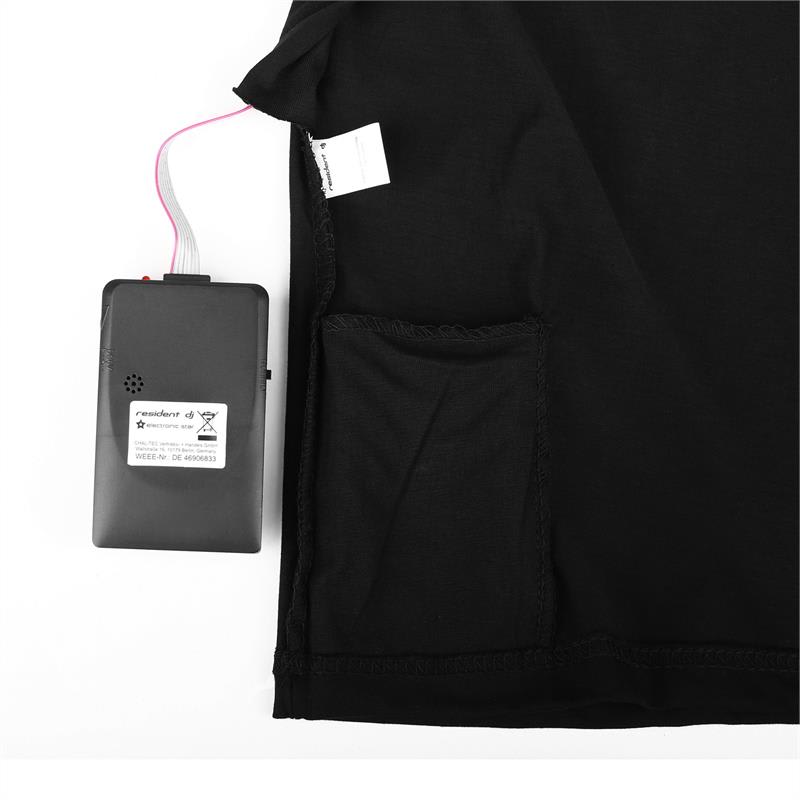 Trendové LED tričko resident dj s LED svetelným efektom, ktorý všetko ožiari, z vás zaručene urobí stredobod každej párty. Najmä v kluboch, kde je zvyčajne dosť tma, je LED motív absolútnym vrcholom a stáva sa prvotriednym kultúrnym objektom. Prekvapené tváre a pohľady sú zaručené.Vaše LED tričko máte vždy pod kontrolou vďaka jednoduchému ovládaciemu panelu. Pomocou káblu je pripojené na úspornú batériu, vďaka ktorej svieti predné logo pomocou LED diód v súlade so zabudovaným mikrofónom a prispôsobuje sa hlasitosti okolia. LED svetlo môžete podľa chuti a naladí kedykoľvek vypnúť alebo zapnúť – pomocou vypínača.Citlivosť mikrofónu môžete veľmi rýchlo nastaviť na okolitú hlasitosť pomocou otočného ovládača, takže tričko podčiarkne vrchol párty pozajtra ako aj únavný hluk dopravy pozajtra. Reprezentatívne.Ovládací panel môžete pohodlne a neviditeľne vložiť do vnútornej tašky a pripnúť, tak aby bola funkčnosť vášho LED trička aj na ďalšie ráno záhadou pre nadšených párty hostí.Keďže iné miesta, iné časy, ako aj spoločenské a individuálne základné nálady vždy potrebujú a budú potrebovať svoje svetelné efekty, motív možno jednoducho zmeniť. Stačí jednoducho starý motív odobrať a prilepiť nový.Vďaka odnímateľnosti motívu môžete vaše LED tričko prať teraz s vašimi druhými, tretími alebo štvrtými najobľúbenejšími tričkami.Život ostatných nebol nikdy fádnejší.
