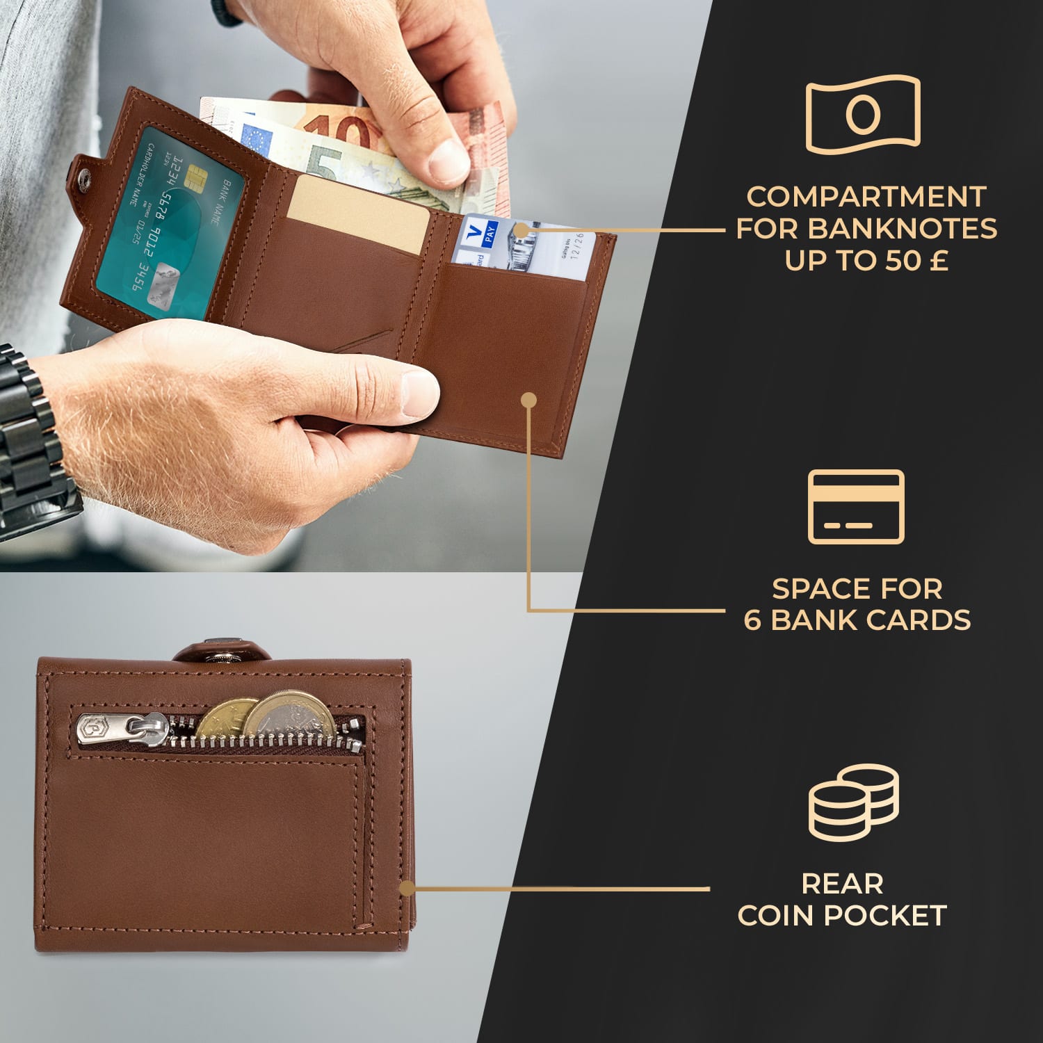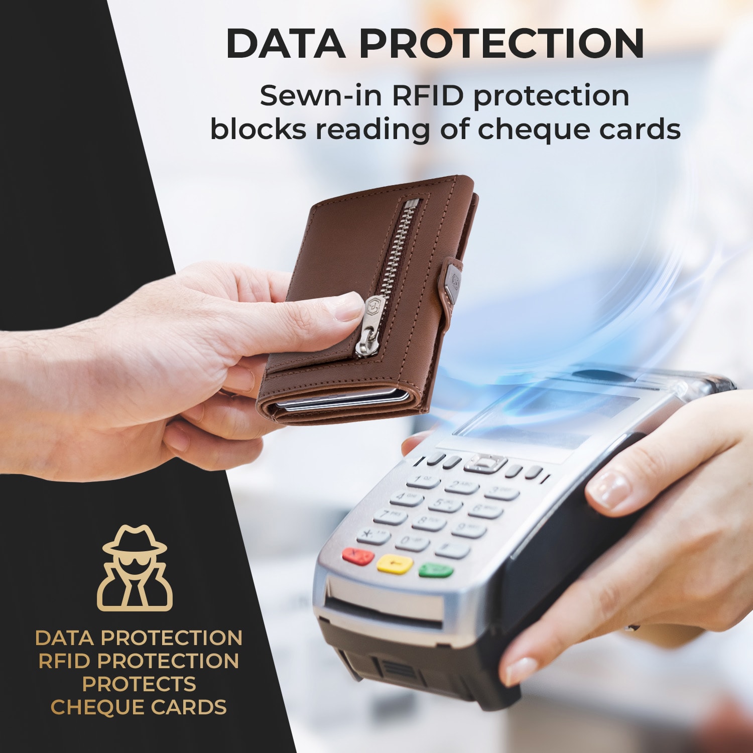S TRYO Wallet od slimpuro sa vaša peňaženka zmenší na rozmery 9,2 x 2,2 x 7,5 cm (Š x V x H). Samozrejme, všetko dôležité máte stále pri sebe: tenká peňaženka má priestor až na 5 kariet a množstvo bankoviek. Súčasne je k dispozícii aj praktické ID-Window a vrecko pre mince na zips na zadnej strane. Tri krát preložené a všetko bezpečne uzavreté spínacím gombíkom zostane všetko na svojom mieste. Mini peňaženka sa dodáva priamo s ochrannou kartou RFID, ktorá zabezpečuje vaše bankomatové karty proti krádeži údajov. Šikovná, praktická a elegantná: to je peňaženka TRYO od slimpuro.