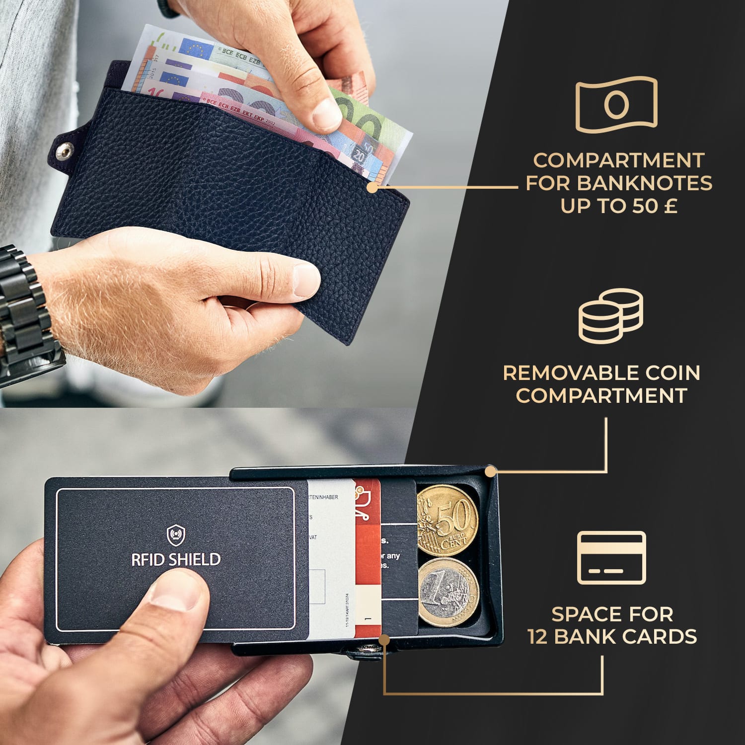 Malá, plochá a dobre usporiadaná: s peňaženkou ZNAP Airtag Wallet od slimpuro sa vaša peňaženka zmenší na rozmery 8 x 1,8 x 6 cm (Š x V x H). K dispozícii je samozrejme priestor až na 12 kariet, ako aj na bankovky a mince. Mini peňaženka s robustným hliníkovým puzdrom a ochrannou kartou RFID chráni vaše bankové karty pred krádežou údajov. Zvláštnosť slimpuro ZNAP Airtag peňaženky je zrejmá: na vrchnej strane je malé vrecko na používanie Apple AirTag. Ak peňaženku stratíte, vždy ju rýchlo a spoľahlivo nájdete, nech ste kdekoľvek. Šikovná, jednoduchá a elegantná: budúcnosť peňaženky sa volá ZNAP Airtag od Slimpuro.Upozorňujeme, že súčasťou balenia nie je Apple AirTag.