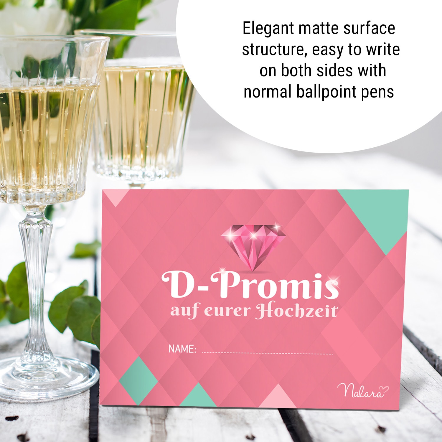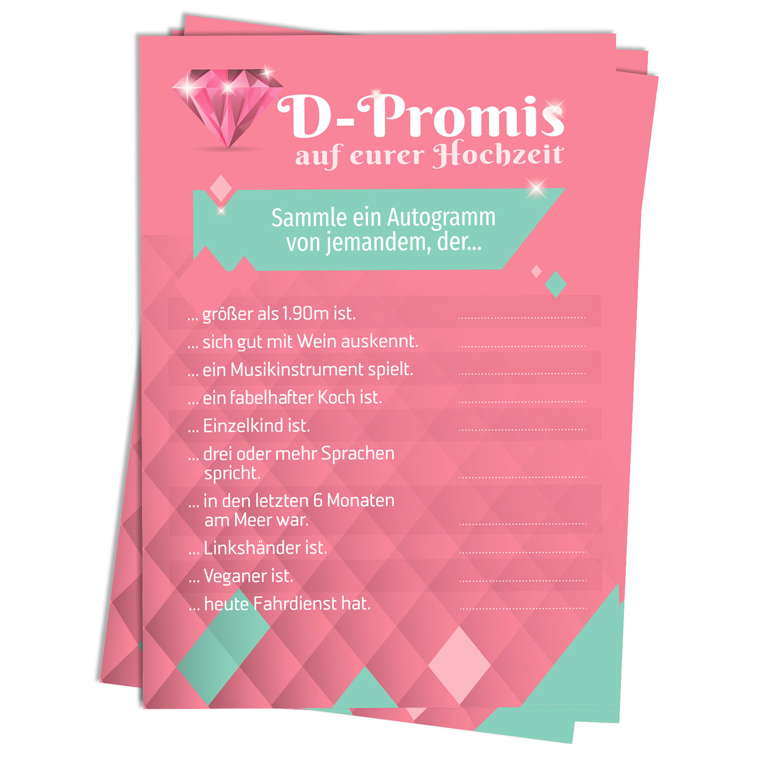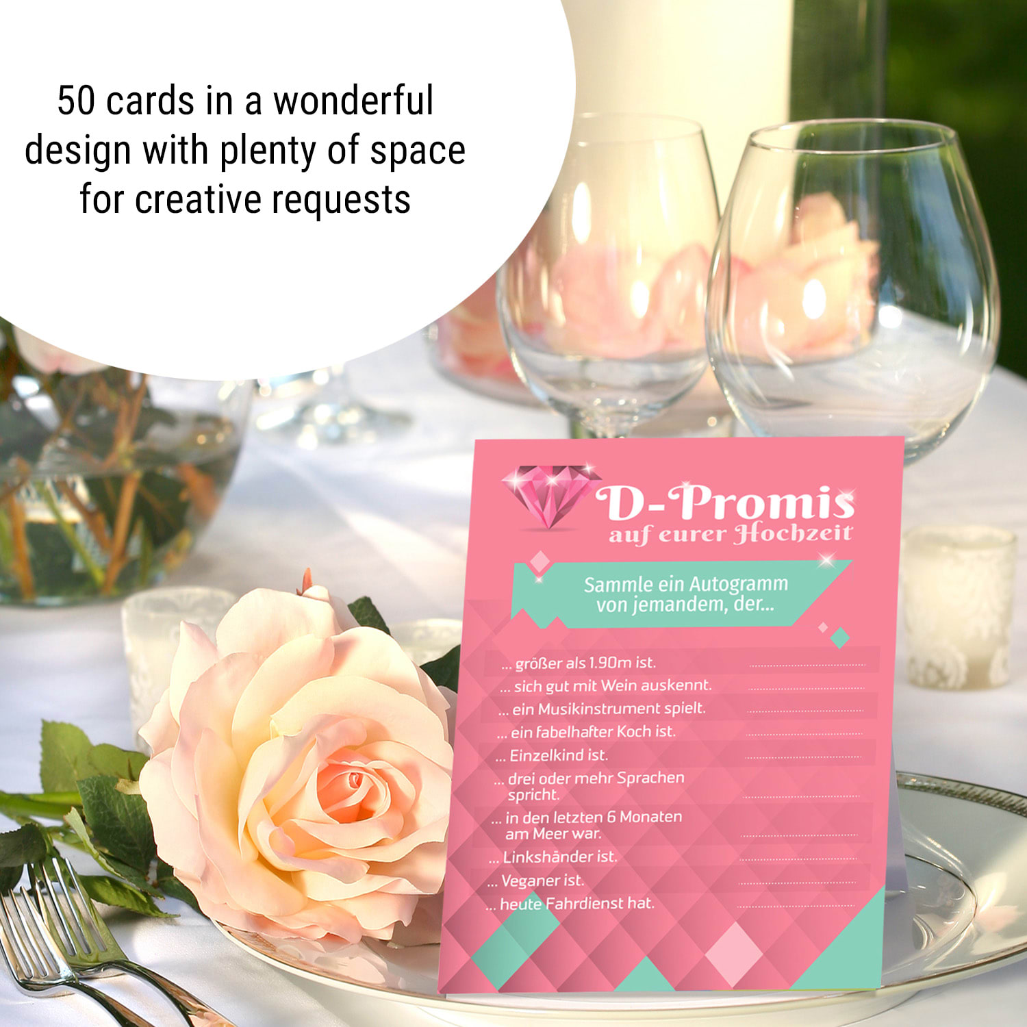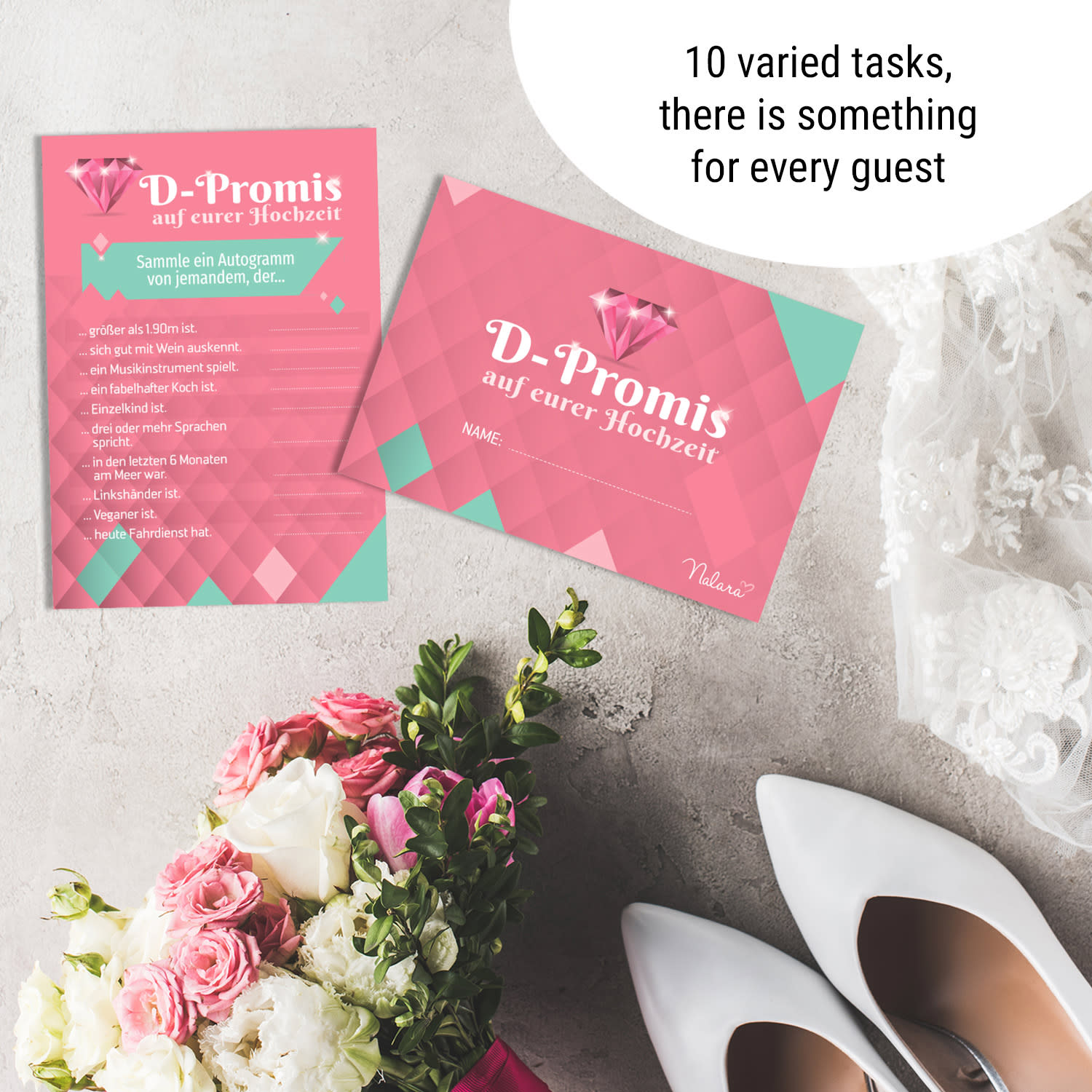 Zábavná svadobná hra D Celebrities od Spielehelden premení vašu svadbu na svadbu celebrít. Hracie karty spájajú vašich hostí a zabezpečia, že sa svadobčania medzi sebou pustia do živej konverzácie. Hra na spoznávanie D Celebrities prináša na párty zábavu a pohyb veľmi jednoduchým spôsobom, pretože každý hosť sa môže jednoducho zapojiť so svojou kartičkou a perom. Na zadnej strane je uvedených 10 vlastností. Teraz je úlohou vyhľadať a nájsť ľudí presne s týmito vlastnosťami. Kto je znalec vína, kto hrá na hudobný nástroj alebo kto je ľavák? Poďme na to! Po nájdení správnej osoby ju požiadate o autogram. Víťazom sa stáva ten, kto ako prvý nazbiera 10 autogramov. Svadobnú hru môžete urobiť ešte nezabudnuteľnejšou vďaka slávnostnému odovzdávaniu cien. Zábavná svadobná hra D Celebrity od Spielehelden dodá zábavu každej vysnívanej svadbe a komunikatívnym spôsobom spojí svadobčanov. Je celkom možné, že sa dokonca nájde ďalší svadobný pár….