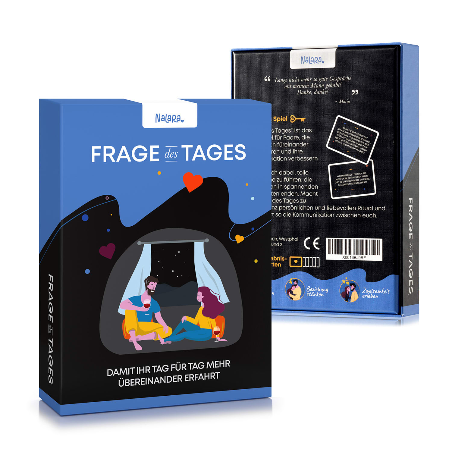 Pre všetky páriky, ktorým nestačí obyčajná otázka „Aký bol tvoj deň“: Rozmanité otázky hry pre párikyFrage des Tages prinášajú podnetnú výmenu názorov či už na záver dňa alebo pri raňajkách. Žiadna otázka o svete, živote, láske či minulosti a budúcnosti tu nepríde z krátka. Otázky sú drzé, netradičné, nezvyčajné. Hravým a povzbudzujúcim spôsobom môže vyjsť najavo jedno alebo dve tajomstvá, ktoré by ste sa inak o sebe nikdy nedozvedeli. Od zdanlivo triviálnych otázok cez hlboké, individuálne úvahy, až po otázky týkajúce sa vzťahov – to všetko tu nájdete. Prináša to veľa zábavy a tiež trochu jasnosti, čo má pre váš vzťah cenu zlata. Kartová hra podnecuje vtipné rozhovory aj hlboké diskusie – je to hravá práca so vzťahmi s ľahkosťou. Čas pre dvoch: Skvelým nápadom je zaradiť kartovú hru Frage des Tages od Spielehelden do každodenného života. Vytvorte si intímny rituál napríklad tak, že si každý večer vytiahnete jednu alebo viacero kariet. Nájdite si čas jeden pre druhého, užite si zábavu a pocíťte nové spojenie, ktoré medzi vami narastie! Láskyplne posilnite svoj vzťah s hravou ľahkosťou: Kartová hra Frage des Tages od Spielehelden vás prostredníctvom živej výmeny názorov spája ako Bonny & Clyde.