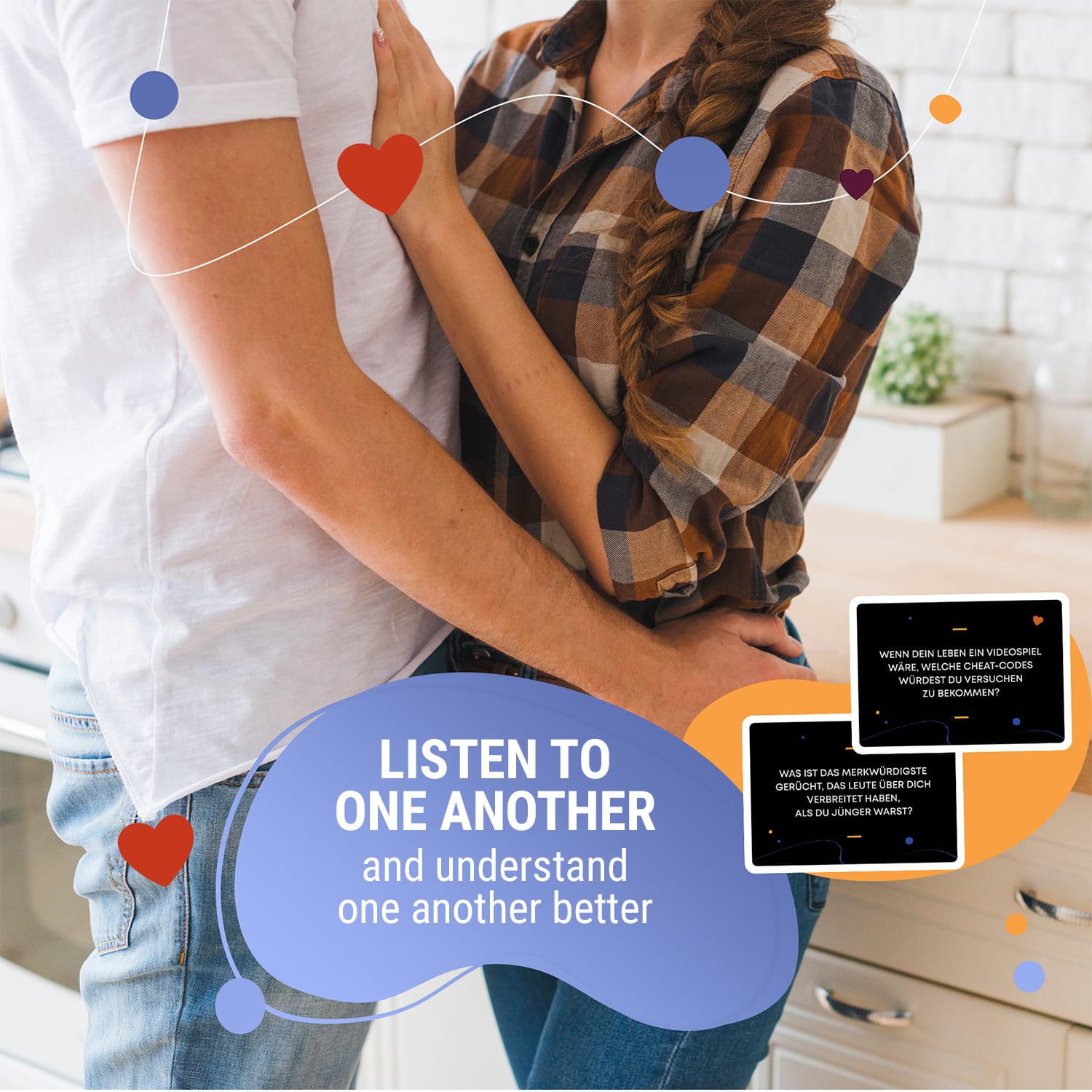 Nič nespája viac, ako keď sa spolu od srdca zasmejete: Zvedavé otázky z hry pre páry Fragen für Paare… zum Lächeln má veľký potenciál vykresliť na vašich tvárach sladké vrásky úsmevu. Otázky sú drzé, netradičné, nezvyčajné. Hravým a povzbudzujúcim spôsobom môže vyjsť najavo jedno alebo dve tajomstvá, ktoré by ste sa inak o sebe nikdy nedozvedeli. Od triviálnych otázok, ako napríklad, aký výrobok je najnepotrebnejší, aké zaklínadlo by ste sa chceli naučiť, až po otázky o vzťahoch – to všetko tu nájdete. Prináša to veľa zábavy a tiež trochu jasnosti, čo má pre váš vzťah cenu zlata. Kartová hra podnecuje vtipné rozhovory aj hlboké hádky. Smejte sa spolu – prostredníctvom hravej práce na vzťahu s ľahkosťou. Čas pre dvoch: Skvelým nápadom je zaradiť kartovú hru Fragen für Paare… zum Lächeln od Spielehelden do každodenného života. Vytvorte si intímny rituál napríklad tak, že si každý večer vytiahnete jednu alebo viacero kariet. Nájdite si čas jeden pre druhého, užite si zábavu a pocíťte nové spojenie, ktoré medzi vami narastie! Láskyplne posilňujte vzťah s hravou ľahkosťou: kartová hra Spielehelden Fragen für Paare… zum Lächeln prinesie vašej láske veľa srdečného smiechu.