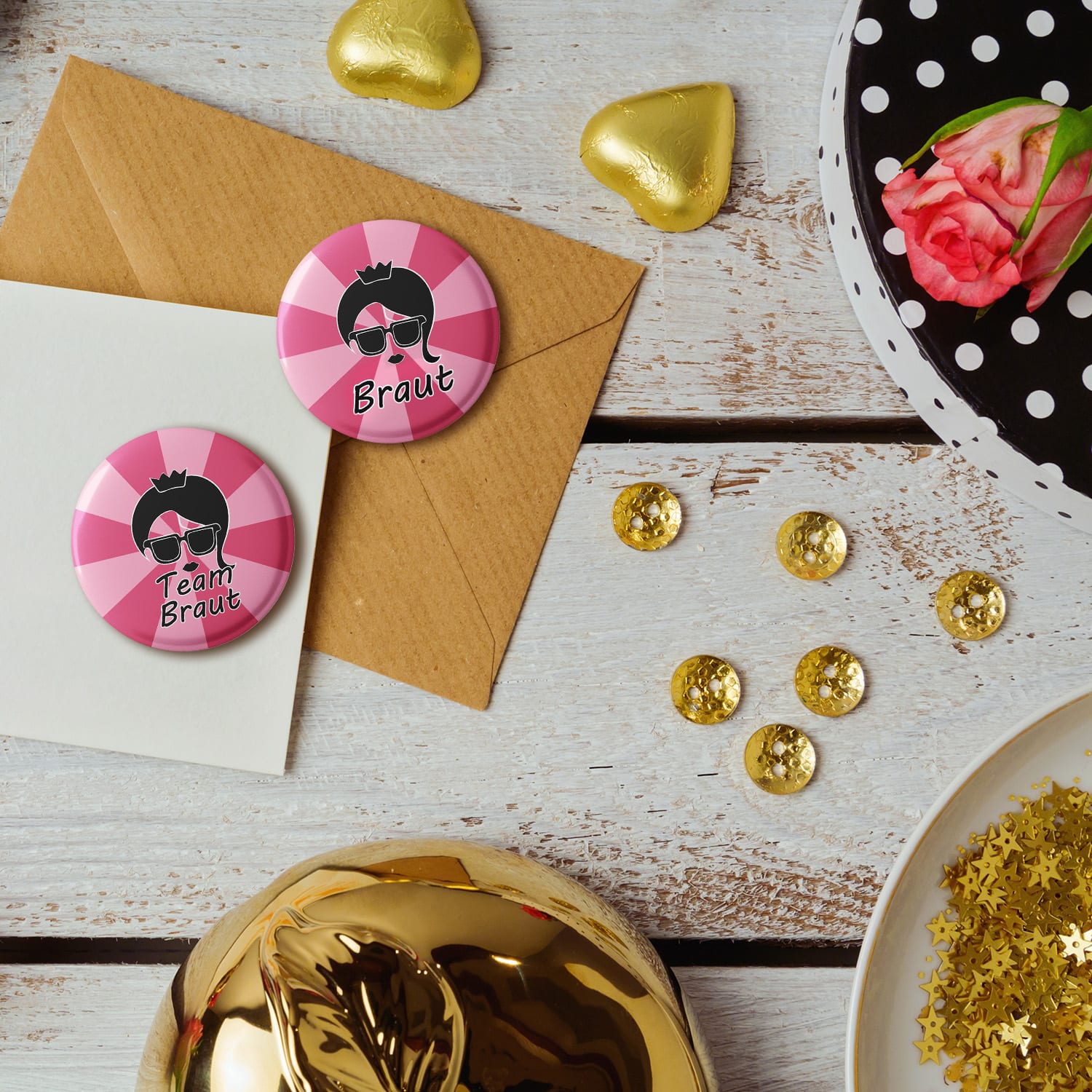 Pred veľkým dňom svadby prichádza na rad rozlúčka so slobodou. Či už ide o krátky výlet do Paríža s priateľkami, wellness víkend medzi ženami alebo jednoducho divokú párty noc – s odznakmi od Spielehelden bude táto jedinečná udalosť nezabudnuteľná. V tejto sade je spolu 12 odznakov na dievčenskú rozlúčku so slobodou: jeden odznak len pre budúcu nevestu s nápisom „Braut“. Ostatných 11 odznakov sú s potlačou „Team Braut“ Kvalita odznakovje tiež pôsobivá a špendlík mimoriadne robustný – takže sa nestratí ani pri divokej párty! Nádherné odznaky sú väčšie ako bežné odznaky , a preto sú ľahko rozpoznateľné. Stačí si ich pripnúť na oblečenie alebo kabelku a ako skupina budete nepriehľadnuteľní. Podporuje to pocit spolupatričnosti v tento výnimočný deň a má to tú výhodu, že z pestrej skupiny dievčat sa rýchlo stane nerozlučná partia, aj keď sa vaše kamarátky predtým nepoznali. Extra veľké odznakyBraut Vintage pink od Spielehelden sú perfektným doplnkom na dievčenskú rozlúčku so slobodou – prebúdzajú tímového ducha v dievčenskej skupine a zároveň sú roztomilou spomienkou.