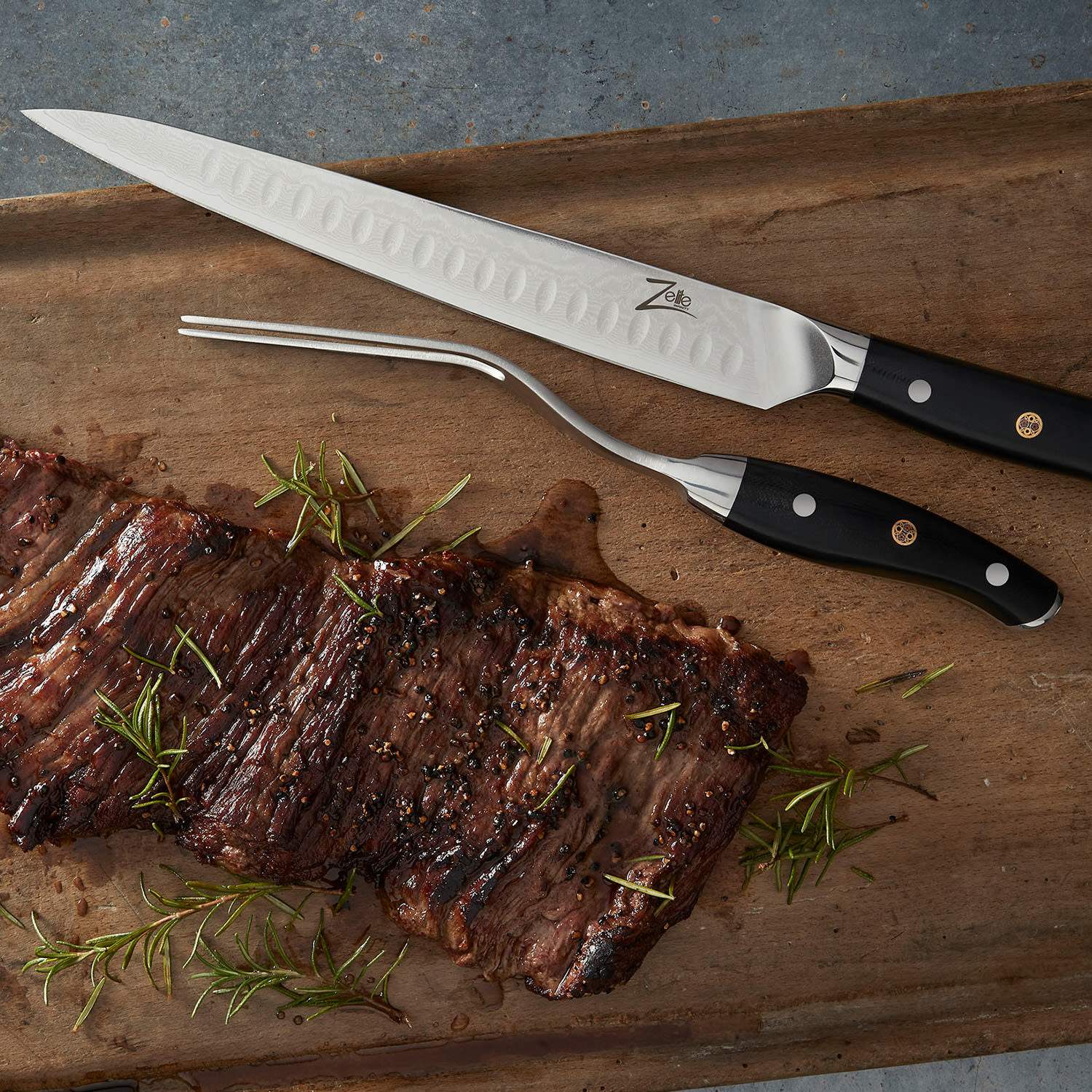 Exkluzívne a precízne nože podľa japonského vzoru: ručne brúsená séria nožov Zelite Infinity by Klarstein Alpha-Royal Japanese spĺňa vysoké nároky každého kuchárskeho umenia. Menistú čepeľ tvorí celkovo 67 vrstiev veľmi kvalitnej japonskej damaškovej ocele. Vďaka svojmu perfektne vyváženému a ergonomickému tvaru a hladkej rukoväti zo skleného vlákna G10 s tromi nitmi sedí tento elegantný kuchynský nástroj dokonale v ruke. Spája sa tu ostrosť, odolnosť, hmotnosť, ovládanie a manipulácia s výnimočným dizajnom, ktoré sú zdokonalené 3 umeleckými kovovými mozaikovými nitmi v rukoväti.Tranžíruj ako šéfkuchár: 10″ tranžírovací príbor zo série Zelite Infinity by Klarstein Alpha-Royal Japanese ti poskytne kvalitné kuchynské nástroje s prekrásnym dizajnom. S ľahkosťou a priamym pohybom sa ti podaria hladké rezy mäsa, zatiaľ čo pomocou vidličky s dlhými hrotmi môžeš pevne uchopiť moriaka, hovädziu hruď, jahňacie koleno alebo šunku. Extra ostrý nôž Granton ti umožní narezať mäso na tenučké plátky, pričom mäso sa neprilepí na ostrie vďaka špeciálnemu výbrusu.