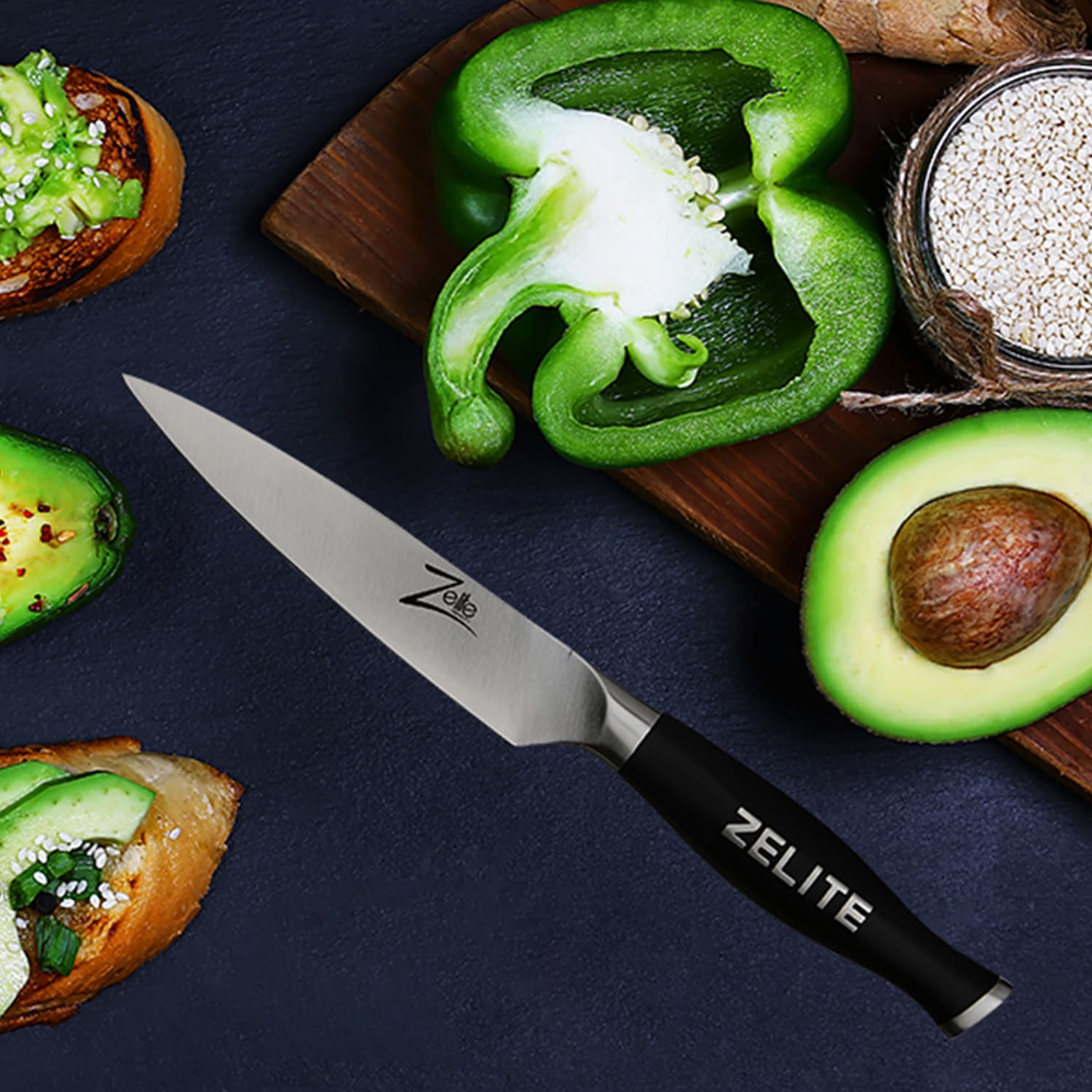 Dokonalé nože pre hobby kuchárov, profesionálov v kuchyni a všetkých, ktorí majú radi ostré nože! Séria nožov Zelite Infinity by Klarstein Comfort Pro kombinuje extrémnu ostrosť, vysokú kvalitu a jednoduchú manipuláciu s elegantným vzhľadom a zjednodušuje krájanie, sekanie alebo lúpanie. Čepele z kvalitnej nemeckej nehrdzavejúcej ocele od spoločnosti Thyssenkrupp sú tvrdé, flexibilné a ostré ako britva. Vďaka prechodu od čepele k záštite bez hrán a štrbín a tiež vďaka ergonomickej rukoväti s perfektným vyvážením sedia dobre v ruke a umožňujú dokonale presné krájanie.5″ univerzálny nôž Zelite Infinity by Klarstein Comfort Pro je mimoriadne vhodný na lúpanie a krájanie ovocia a zeleniny, napríklad citrusového ovocia, ale tiež s ľahkosťou pokrája mäso a syr, akoby krájal maslo. Doplň svoje kuchynské nože alebo ho použi ako perfektný darček pre priateľov, ktorí radi varia.