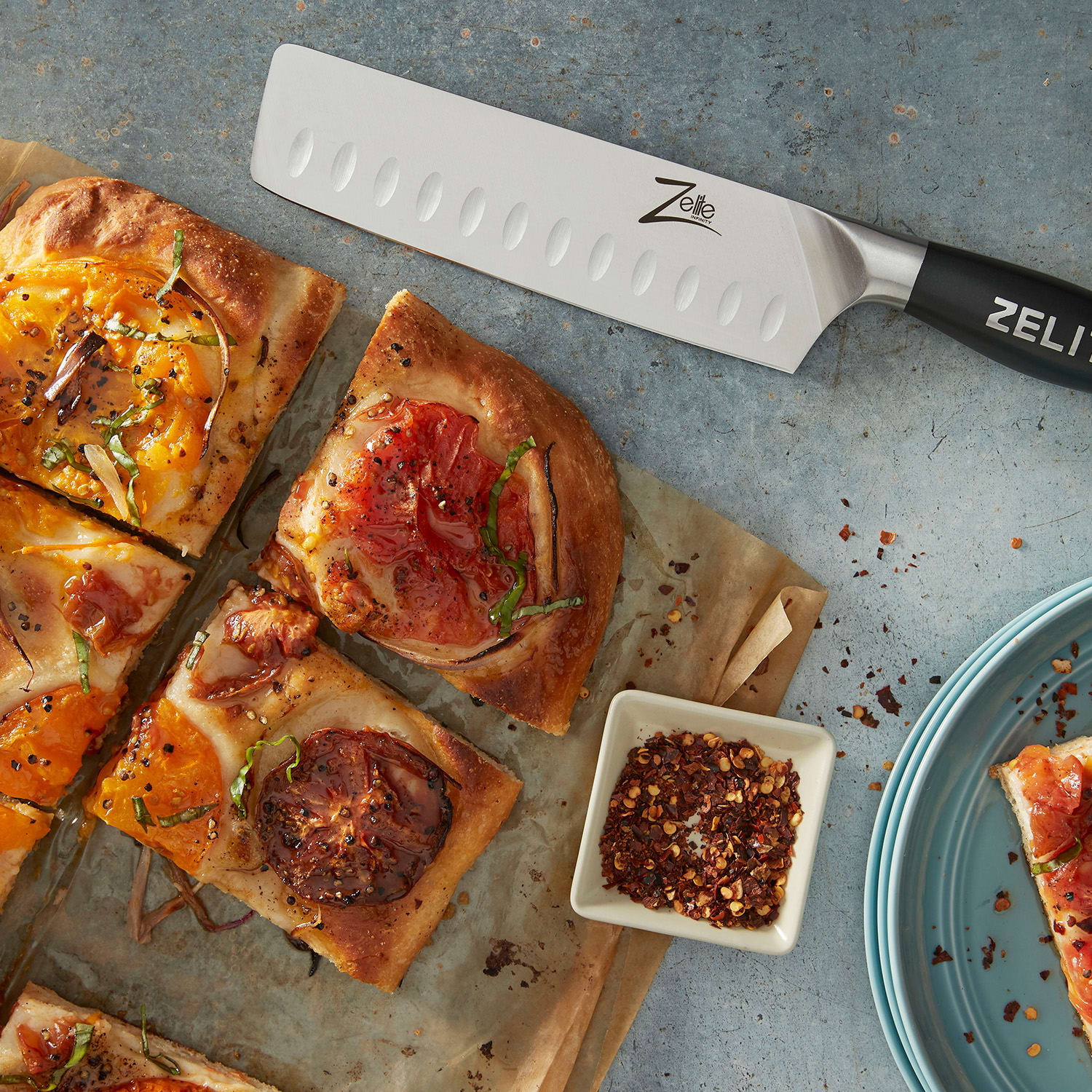 Dokonalé nože pre hobby kuchárov, profesionálov v kuchyni a všetkých, ktorí majú radi ostré nože! Séria nožov Zelite Infinity by Klarstein Comfort Pro kombinuje extrémnu ostrosť, vysokú kvalitu a jednoduchú manipuláciu s elegantným vzhľadom a zjednodušuje krájanie, sekanie alebo lúpanie. Čepele z kvalitnej nemeckej nehrdzavejúcej ocele od spoločnosti Thyssenkrupp sú tvrdé, flexibilné a ostré ako britva. Vďaka prechodu od čepele k záštite bez hrán a štrbín a tiež vďaka ergonomickej rukoväti s perfektným vyvážením sedia dobre v ruke a umožňujú dokonale presné krájanie.7″ nôž nakiri Zelite Infinity by Klarstein Comfort Pro je inšpirovaný japonskými nožmi šéfkuchárov. Tenká, vpredu aj vzadu hranatá čepeľ umožňuje jednoduché sekanie a rezanie tvrdého ovocia až priamo po dosku bez pohybu rezania alebo krájania. A vďaka extra širokej čepeli sa dá následne všetko hneď zobrať a vložiť do woku alebo panvice. Doplň svoje kuchynské nože alebo ho použi ako perfektný darček pre priateľov, ktorí radi varia.